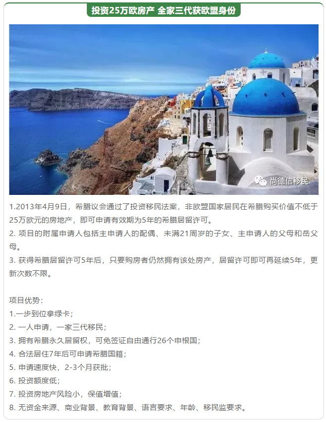 其中,作为新上榜的希腊名列第六位。调研显示,希腊是欧洲投资移民项目中资金要求较低的项目之一,投资者除了通过该项目获取希腊移民身份外,还可以获得可观的房产投资收益,希腊购房移民成为国内投资者的优选。
