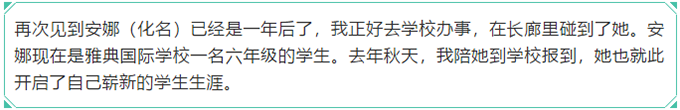 “我居然用极其有限的词汇和句式为助教‘上演了’一出花木兰。”安娜激动的说,老师的鼓励让她渴望表达,她几乎手舞足蹈的讲完了她最喜欢的花木兰替父从军的故事。安娜时常讲故事给Mrs Tompson听,每当被语言限制表达的时候,她总是微笑着给予点头和鼓励,目光满含期待。
