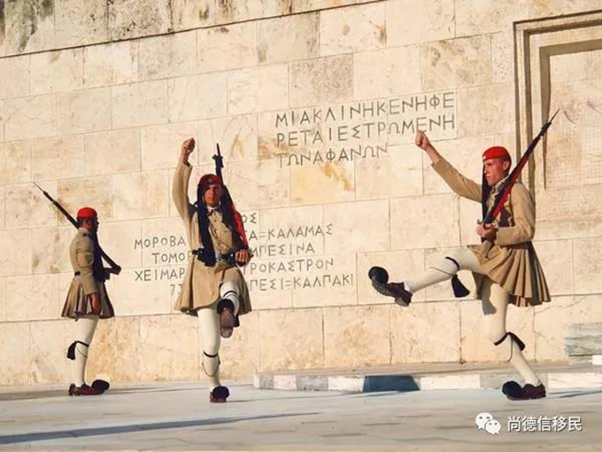 然而,如果你问谁是雅典最可爱的人,他们都会异口同声地告诉你是宪法广场上的卫兵。如果说身高2 米左右的他们在广场巡行本身就是一道风景,那他们穿上民俗服饰之后的样子简直可以用滑稽来形容。红色的贝雷帽、宽摆的裙装、套着长毛袜的羊毛裤、带有毛绒球装饰的木鞋,当这些莫名其妙的元素被放肆地融合在一起并配合着特定的高抬腿和摆臂,你就会理解,雅典人的幽默总是出其不意。