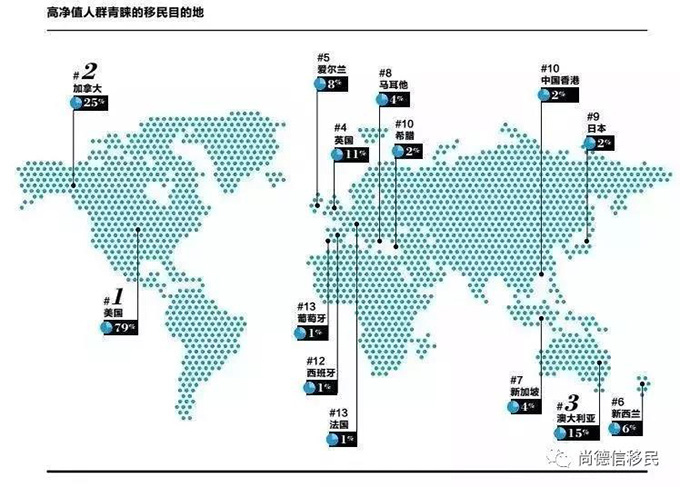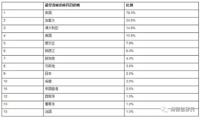 美国以79%蝉联最受青睐的移民目的地榜首。其次是加拿大和澳大利亚,比例分别为25%和15%。