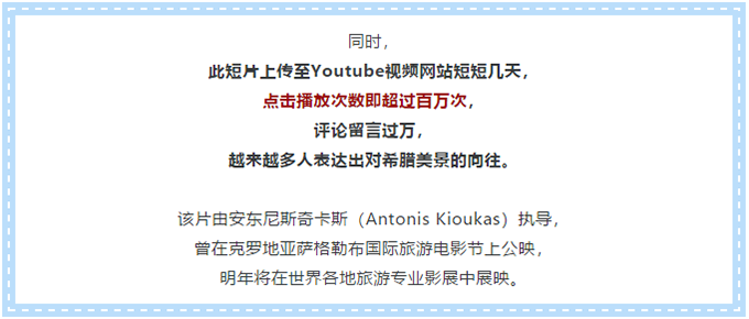 上周,在旅游业电影节国际委员会于维也纳举行的颁奖典礼上,《希腊,一个365天无休的目的地》荣获“人民选择”奖。CIFFT成立于1989年,每年均会选出全球最优秀的旅游业影片或推广片段,并授予相应奖项。