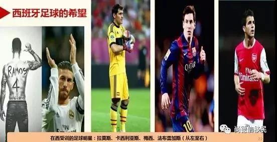 在西班牙受训的足球明星有很多:拉莫斯、卡西利亚斯、梅西、法布雷加斯等。